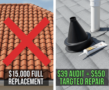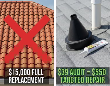 Our $39 Miami Audit identifies the "Targeted Repair Spec." We recently assisted a landlord in Coral Gables who was told they needed a total roof overhaul for $12,000 following a minor storm. Our technical review proved the leak was actually caused by a $60 cracked vent pipe boot and degraded sealant around a single valley. By providing the landlord with the exact technical requirements, they secured a repair for $550—saving over $11,000.